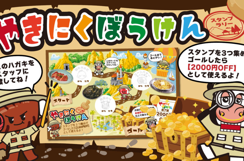 【イベント】夏のやきにくぼうけん スタンプラリー 〜きみはゴールまでたどり着けるかな!?〜 🌞夏のやきにくぼうけん スタンプラリー🌻 〜きみはゴールまでたどり着けるかな!?〜 🌞夏のやきにくぼうけん スタンプラリー🌻 〜きみはゴールまでたどり着けるかな!?〜 2025年7月16日 《 お食事のたびにスタンプを集めて、特典をゲット!》スタンプを 3つ 集めてゴールすると… 2000円OFFクーポン としてご利用いただけます!【参加方法】1.ご来店時にスタッフへ本ハガキをご提示ください。2.お食事1回につき、スタンプを1つ押印いたします。3. スタンプが3つたまりましたら「ゴール」達成!【特典内容】・1回目ご来店:和牛カルビ 1皿プレゼント・2回目ご来店:コーンバター 1皿プレゼント・3回目ご来店:韓国のり 1皿プレゼント→スタンプ3つ達成で【次回≫2000円OFFクーポン】としてご利用可能!【実施期間】ハガキ到着日〜2025年10月31日(木)まで対象店舗:「大阪焼肉・ホルモン ふたご」ふたご王国加盟41店舗実施店舗一覧はこちら ▶︎https://yakiniku-futago.com/ふたご王国/App Store:https://apps.apple.com/jp/app/f-point/id1578054003Google Play:https://play.google.com/store/apps/details?id=com.ftgcompany.fpoint■公式ホームページ:http://www.yakiniku-futago.com/■Instagram:@yakinikufutago.official■X:@futago2515■Tik Tok:@yakiniku.futago_official 《 お食事のたびにスタンプを集めて、特典をゲット!》スタンプを 3つ 集めてゴールすると… 2000円OFFクーポン としてご利用いただけます! 【参加方法】1.ご来店時にスタッフへ本ハガキをご提示ください。2.お食事1回につき、スタンプを1つ押印いたします。3. スタンプが3つたまりましたら「ゴール」達成! 【特典内容】・1回目ご来店:和牛カルビ 1皿プレゼント・2回目ご来店:コーンバター 1皿プレゼント・3回目ご来店:韓国のり 1皿プレゼント→スタンプ3つ達成で【次回≫2000円OFFクーポン】としてご利用可能! 【実施期間】ハガキ到着日〜2025年10月31日(木)まで 【対象店舗】「大阪焼肉・ホルモン ふたご」ふたご王国加盟41店舗実施店舗一覧はこちら ▶︎https://yakiniku-futago.com/ふたご王国/ App Store:https://apps.apple.com/jp/app/f-point/id1578054003Google Play:https://play.google.com/store/apps/details?id=com.ftgcompany.fpoint■公式ホームページ:http://www.yakiniku-futago.com/■Instagram:@yakinikufutago.official■X:@futago2515■Tik Tok:@yakiniku.futago_official