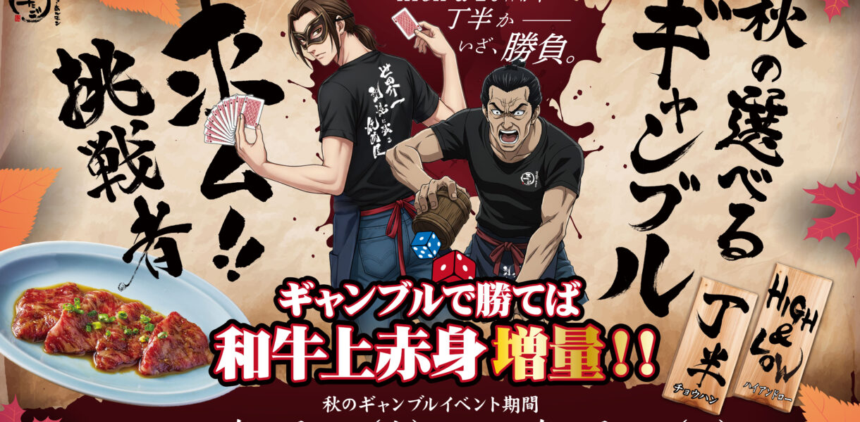 【イベント】 五感で楽しむ”焼肉エンターテイメント「大阪焼肉・ホルモンふたご」 “五感で楽しむ”焼肉エンターテイメント「大阪焼肉・ホルモン ふたご」、和牛上赤身があなたの”運“次第で増え続ける!和牛上赤身増量イベント挑戦者募集中! “五感で楽しむ”焼肉エンターテイメント「大阪焼肉・ホルモン ふたご」、和牛上赤身があなたの”運“次第で増え続ける!和牛上赤身増量イベント挑戦者募集中! 2025年10月10日(金)~11月30日(日)まで開催 株式会社FTG Company(本社:東京都目黒区、代表取締役社長:森川誠)が運営する「大阪焼肉・ホルモン ふたご」(以下「焼肉ふたご」)は、2025年10月10日(金)~11月30日(日)の期間限定で「和牛上赤身増量イベント」をスタートします。和牛上赤身979円(税込)をご注文の全てのお客様に2種類のゲームから選択していただき、勝つ度に和牛上赤身が増量します! 株式会社FTG Company(本社:東京都目黒区、代表取締役社長:森川誠)が運営する「大阪焼肉・ホルモン ふたご」(以下「焼肉ふたご」)は、2025年10月10日(金)~11月30日(日)の期間限定で「和牛上赤身増量イベント」をスタートします。和牛上赤身979円(税込)をご注文の全てのお客様に2種類のゲームから選択していただき、勝つ度に和牛上赤身が増量します! 「和牛上赤身増量イベント」について 今年の秋の「焼肉ふたご」は、人気メニュー「和牛上赤身」を大盤振る舞い!ご注文いただいた全てのお客さまは「HIGH&LOW」か「丁半」からお好きなゲームを選び挑戦できます。勝つ度にどんどん増量し、枚数に制限はありません!負けたら勝ち分がなくなってしまうので、やめ時もお客さまの運次第! 「和牛上赤身増量イベント」について 今年の秋の「焼肉ふたご」は、人気メニュー「和牛上赤身」を大盤振る舞い!ご注文いただいた全てのお客さまは「HIGH&LOW」か「丁半」からお好きなゲームを選び挑戦できます。勝つ度にどんどん増量し、枚数に制限はありません!負けたら勝ち分がなくなってしまうので、やめ時もお客さまの運次第! 【販売期間】 2025年10月10日(金)~2025年11月30日(日) 【販売期間】 2025年10月10日(金)~2025年11月30日(日) 【提供店舗】 「大阪焼肉・ホルモン ふたご」国内全店舗 【提供店舗】 「大阪焼肉・ホルモン ふたご」国内全店舗 【イベント概要】 和牛上赤身979円(税込)をご注文の全てのお客さまに、下記ゲームにご参加いただけます。 ■【HIGH & LOW】のルール1. シャッフルしたトランプの山札から1枚めくる2. 次のカードが「HIGH(大きい)」か「LOW(小さい)」を予測3. 当たればトランプを1枚獲得! → 持っているカード枚数 × 和牛上赤身を増量・はずれ or 同じ数字が出たら終了、それまでの勝ち分は没収…!・トランプはいつでもシャッフルOK!・やめるタイミングはお客さまの申告制! ■【丁半(チンチロ)】のルール1.スタッフがサイコロ2個を振って蓋をする2. 出目の合計が「丁(偶数)」か「半(奇数)」を予測! →当たれば 上赤身を2枚追加GET! ※F-POINTアプリ会員様限定のイベントですので、ご参加時にはスタッフにアプリをお見せください。※1皿ご注文ごとに1回挑戦でき、回数に制限はありません。※詳細は店舗にてご確認ください。 【イベント概要】 和牛上赤身979円(税込)をご注文の全てのお客さまに、下記ゲームにご参加いただけます。 ■【HIGH & LOW】のルール1. シャッフルしたトランプの山札から1枚めくる2. 次のカードが「HIGH(大きい)」か「LOW(小さい)」を予測3. 当たればトランプを1枚獲得! → 持っているカード枚数 × 和牛上赤身を増量・はずれ or 同じ数字が出たら終了、それまでの勝ち分は没収…!・トランプはいつでもシャッフルOK!・やめるタイミングはお客さまの申告制! ■【丁半(チンチロ)】のルール1.スタッフがサイコロ2個を振って蓋をする2. 出目の合計が「丁(偶数)」か「半(奇数)」を予測! →当たれば 上赤身を2枚追加GET! ※F-POINTアプリ会員様限定のイベントですので、ご参加時にはスタッフにアプリをお見せください。※1皿ご注文ごとに1回挑戦でき、回数に制限はありません。※詳細は店舗にてご確認ください。 App Store:https://apps.apple.com/jp/app/f-point/id1578054003Google Play:https://play.google.com/store/apps/details?id=com.ftgcompany.fpoint■公式ホームページ:http://www.yakiniku-futago.com/■Instagram:@yakinikufutago.official■X:@futago2515■Tik Tok:@yakiniku.futago_official App Store:https://apps.apple.com/jp/app/f-point/id1578054003Google Play:https://play.google.com/store/apps/details?id=com.ftgcompany.fpoint■公式ホームページ:http://www.yakiniku-futago.com/■Instagram:@yakinikufutago.official■X:@futago2515■Tik Tok:@yakiniku.futago_official