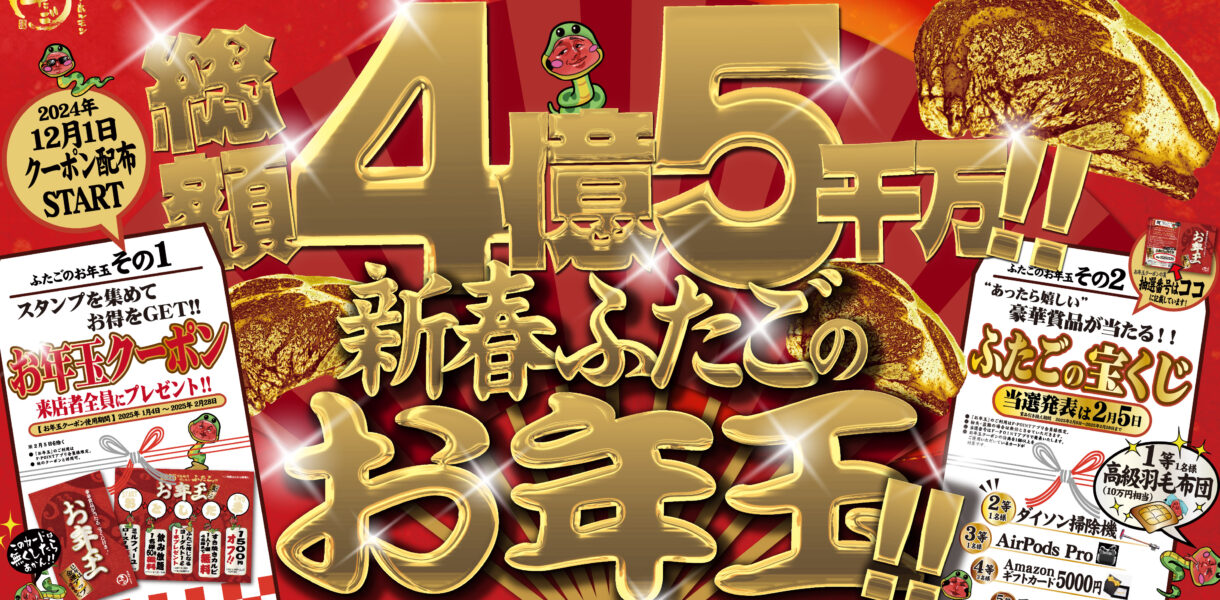 【イベント】新春ふたごのお年玉キャンペーン‼︎ 【イベント】新春ふたごのお年玉キャンペーン‼︎ 2024年12月1日 総額4億5千万!?ふたごの新春お年玉スタート!! 【 お年玉クーポン配布期間 】12月1日(日)〜 なくなり次第終了!! ふたごの2024年最後を締めくくるイベントは総額4億5千万の新春お年玉キャンペーン‼︎12月1日から配布スタートのお年玉カードはスタンプを集めるとそのコマに応じてお得なプレゼントいたします‼︎そしてさらにそのお年玉クーポンは「ふたごの宝くじ」の抽選番号が入っていて“あったら嬉しい豪華賞品”が当たる宝くじとなっています!その当選発表は2月5日のふたご祭で‼︎それまでクーポンは捨てずにぜひ保管しておいてくださいね!今年も残りわずかですが、年末もふたごで焼肉を楽しみましょう! ■ クーポン配布期間:2024年12月1日(日) ~ なくなり次第配布終了■クーポン使用期間 : 2025年1月4日(土) ~ 2025年2月28日(金)■ふたご宝くじ当選発表日 : 2025年2月5日(水)■ 実施店舗:国内の「大阪焼肉・ホルモン ふたご」 ふたごの2024年最後を締めくくるイベントは総額4億5千万の新春お年玉キャンペーン‼︎ 12月1日から配布スタートのお年玉カードはスタンプを集めるとそのコマに応じてお得なプレゼントいたします‼︎ そしてさらにそのお年玉クーポンは「ふたごの宝くじ」の抽選番号が入っていて“あったら嬉しい豪華賞品”が当たる宝くじとなっています!その当選発表は2月5日のふたご祭で‼︎それまでクーポンは捨てずにぜひ保管しておいてくださいね! 今年も残りわずかですが、年末もふたごで焼肉を楽しみましょう! ■ クーポン配布期間:2024年12月1日(日) ~ なくなり次第配布終了■クーポン使用期間 : 2025年1月4日(土) ~ 2025年2月28日(金)■ふたご宝くじ当選発表日 : 2025年2月5日(水)■ 実施店舗:国内の「大阪焼肉・ホルモン ふたご」