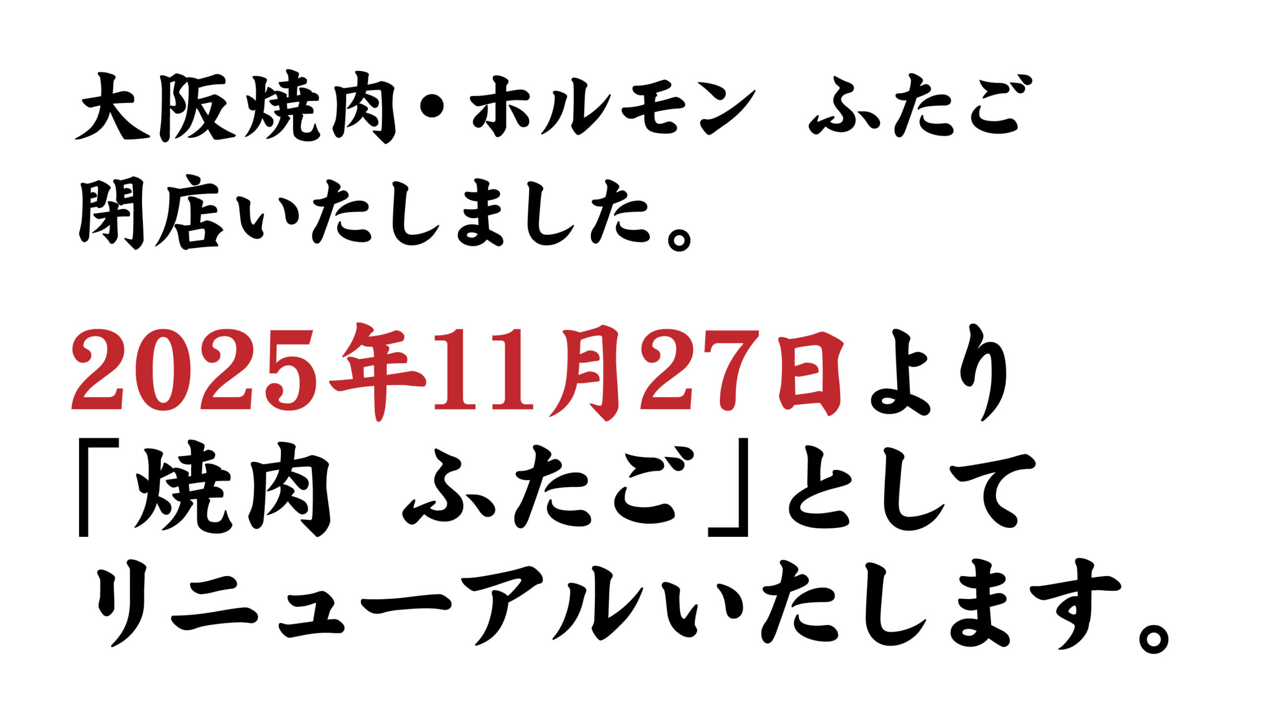 大阪焼肉・ホルモン ふたご 五反田本店(閉店) 大阪焼肉・ホルモン ふたご 五反田本店(閉店) 大阪焼肉・ホルモン ふたご 五反田本店 15周年を迎え、新たに「焼肉 ふたご」として生まれ変わります。詳細は後日お知らせいたします。 15周年を迎え、新たに「焼肉 ふたご」として生まれ変わります。 2025年11月末オープン予定。 前 次 店舗名 大阪焼肉・ホルモン ふたご 五反田本店(閉店) 予約・お問い合わせ 予約可否 住所 googleMap 営業時間 予算 支払い方法 席数 個室 空間設備 利用シーン 貸切 禁煙・喫煙 駐車場 備考欄